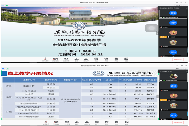 为全面了解线上教师教学和学生学习情况,推进教学诊断与改进工作,确保线上教学有序开展和质量跟踪可控,根据本学期学校教学工作安排,4月22日下午电气学院开展2019-2020学年春季学期线上教学期中检查工作会议。会议由教科研主管徐旺主持,院领导、全体专职教师、毕业班辅导员参加会议。(会议主题)会议期间,徐旺首先介绍了本次线上教学期中检查的内容包括课程资源、教学过程、教风及学风、教研活动、毕业设计、企业实习等方面,督促各位老师要结合检查情况,积极解决影响线上教学秩序和线上教学效果的突出问题。对于本学期教研室线上教学科研工作的开展情况,四位教研室副主任就教研室期中教学自查情况、毕业设计整改、项目申报、教研室活动等方面做了详细的汇报。王伟详细介绍了电气教研室线上教学开展情况如作业次数、出勤率和学生观看学习视频的情况;梁美玉重点汇报了电信专业评估工作的进展情况。随后陈坚伟副院长介绍了19届毕业生实习总结报告提交情况和目前毕业生就业情况。他指出毕业设计指导老师应主动关注学生就业问题,积极推动和引导学生