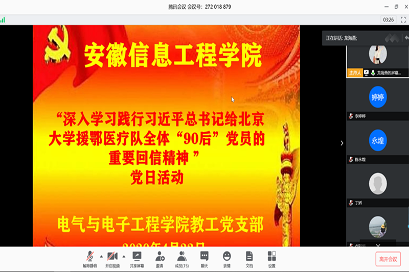 4月22日中午,电气学院教工党支部开展深入学习习近平总书记给北京大学援鄂医疗队全体“90后”党员的重要回信精神专题党日活动,掀起了联学接力、互动分享的学习热潮。(党员活动日主题)首先,党支部副书记龙海燕通过一段视频向党支部同志们展示了“90后”党员是如何用实际行动担当大任的。视频内容展现了在新冠肺炎疫情防控斗争中,以“90后”为代表的新时代中国青年一代不惧艰险、冲锋在前和无私无畏的奉献精神,以及爱国奋斗、自强不息、奋发向上、蓬勃昂扬的青春精神风貌。(学习回信内容)随后,组织委员张天飞诵读了习近平总书记给北京大学援鄂医疗队全体“90后”党员的重要回信内容。习近平总书记在回信中写道:“广大青年用行动证明,新时代的中国青年是好样的,是堪当大任的!”回信内容充分肯定了“90后”党员为抗疫斗争做出的贡献和牺牲,并激励着广大青年勇挑重担,为打赢疫情防控阻击战贡献力量,让青春在党和人民最需要的地方绽放绚丽之花!回信精神让学院青年教师倍感振奋、备受鼓舞。龙海燕并倡议所有党员“谈体会、话担当”,通过“说”
