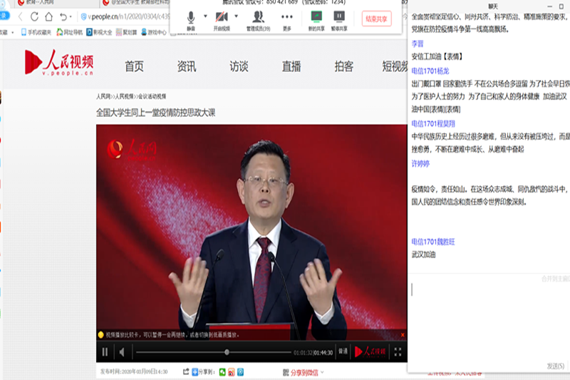 陌上轻寒,拢不住一烟黛翠,正如疫情险恶,终敌不过万众攻坚。值此暖春四月,为进一步响应学校号召,督促学生严格落实居家防疫,居家学习,提升自我。软件1701-1704班于4月13日线上召开“让青春在战役中绽放,让理想在行动中闪光”主题班会,班会由辅导员薛梦婷主持,软件1701-1704班全体学生参会。再见寒冬,让青春在战役中绽放。班会第一项,薛梦婷以六张分别代表“热情、成长、担当、坚韧、积极、勇敢”六种寓意的战役“逆行者”的照片开始讲解,同时激发大家自我反思:作为一名90甚至是00后,我们在这场疫情战场应该是不落后的。随后她提出三点要求:一、思想高度重视:青年大学习;二、行动快速有效:今日校园平安打卡;三、疫情期间注意事项:(1)注意防护(2)心理积极调适(3)少出门,多宅家。(图为线上会议截图)让理想在行动中闪光,班会第二项,战胜疫情的国之重器源自中国医学研究的最高水平,由钟南山院士和李兰娟院士的事迹警醒同学们想要实现理想务必要将其落实在行动上。薛梦婷表示“网课可以选择让人代刷,但无知的代