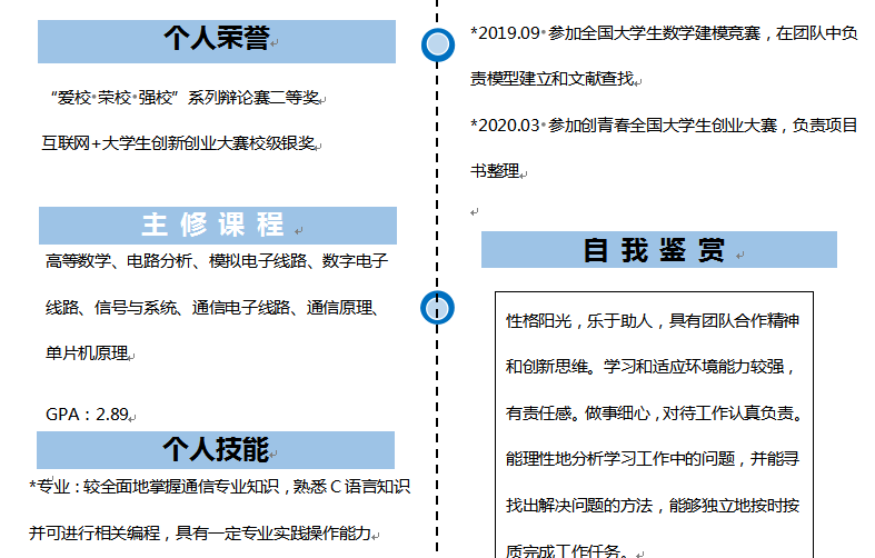 简历,被喻为是求职成功的第一块敲门砖,更是初入职场的大学生们给予面试官的第一印象。为增强就业意识,强化求职技能,电气学院举办“精‘简’自己,砥‘历’前行”简历设计大赛。一张张简历承载着参赛者们对未来的规划。参赛者设计的简历作品内容充实、全面,能从个人基本情况出发,涵盖了包括求职意向、教育背景、社会实践、所获荣誉等方面,简历内容个性鲜明,设计版面美观大方、格式清晰。“给我一个机会,创造无限可能。作为队长,参加全国高校‘创新 创意 创业’电子商务挑战赛获校级三等奖;作为参谋,参加‘互联网+’大学生创新创业大赛获校级优秀奖;任职校学生会委员一年,身为部门负责人组织各类志愿活动。”这是来自电信1802施良荣同学在她的作品里对自己的经历做的一段自述,虽然现在大二,但对未来可以说已经规划比较清晰:“毕业后想在专业所属的行业内有所发展”。(部分作品) 学院团总支华静表示,此次线上简历大赛是在当前网上求职签约背景下一次很有意义的在校生职业成长活动,通过本次活动同学们可以秀出自己的职业风采,在老师的指导下