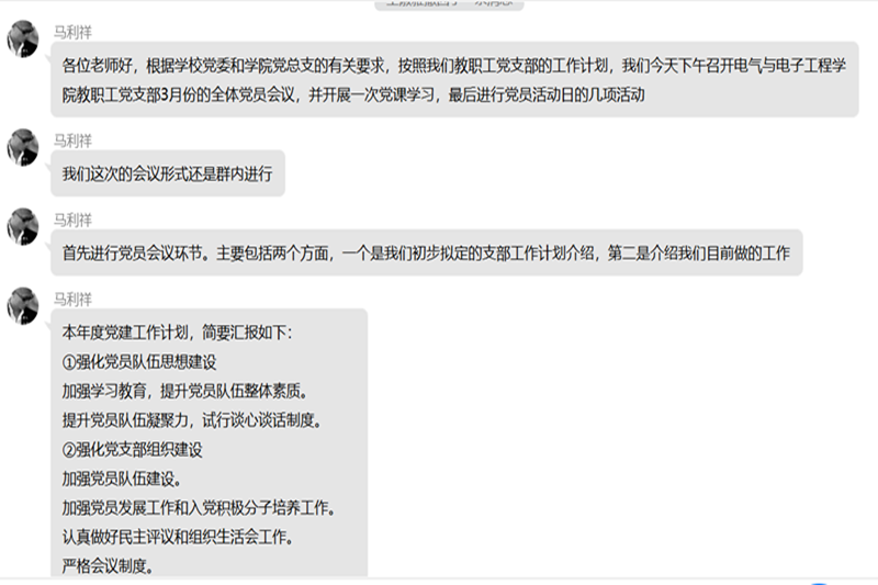 疫情防控期间,电气学院教职工党支部积极开展线上组织生活。3月25日下午,党支部组织全体党员召开线上党员大会,会议内容分为党员大会、党课学习和党日活动三个部分。(马利祥主持会议)支部书记马利祥首先介绍了本年度党建工作计划,主要围绕强化党员队伍思想建设、党支部组织建设和工作作风建设等方面;随后他带领教职工党员学习了《教育系统关于学习宣传贯彻落实<新时代爱国主义教育实施纲要>的工作方案》和“习近平总书记在统筹推进新冠肺炎疫情防控和经济社会发展工作部署会议上重要讲话精神”,强调要在教育系统扎实开展深入、持久、生动的爱国主义教育,着力培养德智体美劳全面发展的社会主义建设者和接班人而提出的方案,侧重明理,更提倡力行。(教工党支部线上学习交流)会议第三项议程是开展线上党员活动日,本次活动日的主题是“疫”同学习、“疫”同前行。支部成员观看了“疫情无情,人间有情”的视频,互相交流,发表心得体会。马利祥老师表示:“一手抗疫,一手教学仍然是我们后面一段时间的重要工作,两手都要抓,两手都要硬,抗疫的成果,来之不