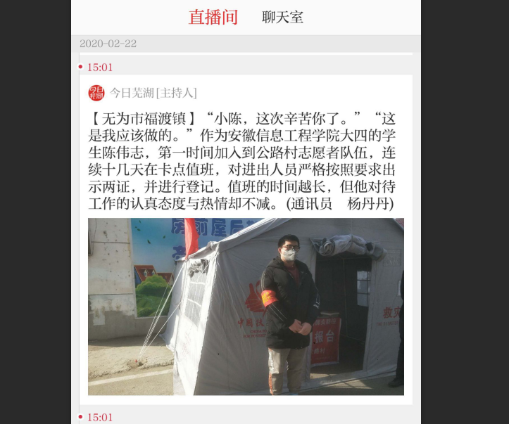 抗击疫情,志愿同行!电气学院电气1604班陈伟志,作为无为县人,身在芜湖市疫情最严重地区,疫情期间,他志愿加入所在村的志愿者队伍,与村干部共同坚守在公路卡点,配合值班人员检查每一位进出村民的通行证,并进行健康信息登记、测体温,这一守,就是18天。陈伟志说:“作为村里的大学生,我有义务为家乡服务,共同抗“疫”,体现我们当代大学生的责任感和使命感。” (“今日芜湖”的一张特写) (陈伟志(中)与“战友”们的坚守)重复工作天天不变样,平凡工作处处不简单。虽然值班的时间很长,但他对待工作的态度和热情丝毫未减,他的这一精神,也被“今日芜湖”专题报道。当被问及参加这次志愿的收获时,陈伟志感触颇多:“我亲身感受到一线的基层工作者的耐心细致,要多向他们学习,留心工作方法、沟通技巧,要用诚心换理解,以真心换支持,这是不断提高工作成效的最好方式。”我们坚信,我们等待,等到春暖花开,这场全面胜利的到来。(文/图 华静、陈伟志 核/吕海涛 审/孙惠玲)