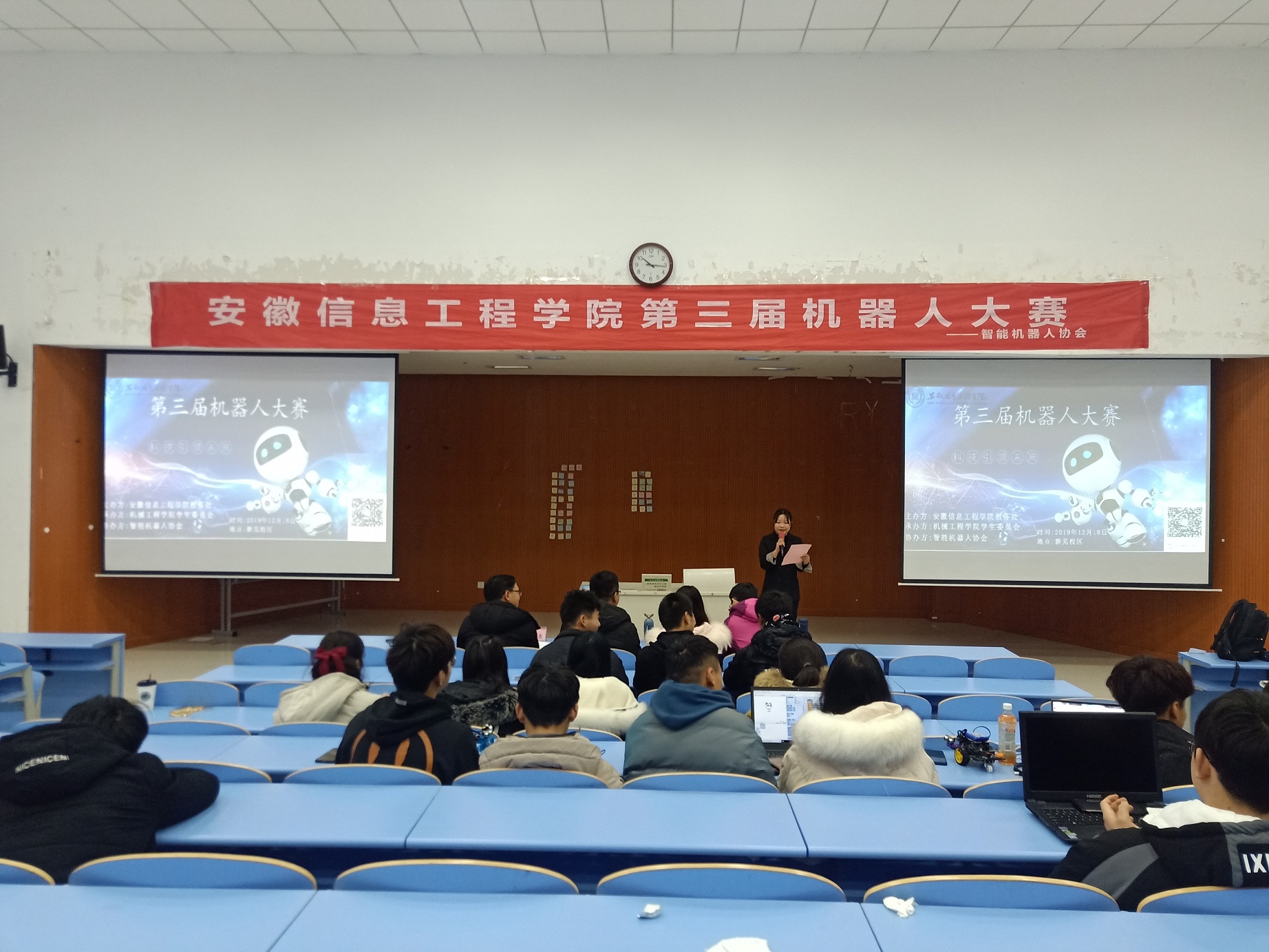 为了进一步提升大学生的创新能力和实践动手能力, 12月21日上午10点,安徽信息工程学院第三届机器人大赛在A1教学楼W101教室拉开帷幕。机械工程学院王晓云、苗思忠、于凯烁、李飞等老师出席活动并担任评委。本次大赛由教务处主办、机械工程学院学生委员会承办、智能机器人协会协办,共有20余支队伍参赛。(比赛现场图)比赛开始前王晓云介绍了我国机器人科技的发展历史和前景以及学校有关机器人项目的各项研究成果,希望同学们能继续发扬创新精神,不断学习、探索、研究,为科技做出自己的贡献,同时也预祝本次比赛圆满成功。(王晓云发言)本次比赛分为机器人组、慧鱼组、Makeblock组,参赛团队向评委提交赛前组装好的机器人作品,并现场进行解说和调试,各队都全力以赴,尽量把自己的作品完美呈现给大家,比赛现场也是热闹非凡,有选手的精彩解说,机器人的精彩表演,还有阵阵掌声。评委老师们也对各队作品点评,并给予指导意见。在接近四个小时的激烈角逐中,awsl团队的“逐梦号”作品脱颖而出,取得第一名的好成绩。(调试机器人)(