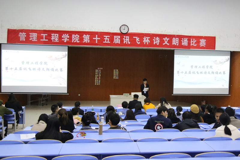 为弘扬优秀文化传统,提升大学生的文化素养,11月19日晚,管理工程学院第十五届“讯飞杯”诗文朗诵比赛在A1W101教室举办。此次大赛由19级辅导员戴军森、邵先龙,以及17级辅导员卫雨婷担任评委;史可晗担任本次比赛的主持人。 (比赛开幕) (选手比赛中) (选手比赛中)此次比赛共有16组选手参加,选手分三轮依次进行自备诗文朗诵,评委老师对选手表现进行现场评分;并在每轮结束后由史可晗公布选手成绩得分。三轮结束后由工作人员对选手成绩进行统计。在此比赛中选手们都发挥得尤为出色有曹子陆,陈章怡,王秋晨三人齐诵《我的祖国》;有王剑成,周瑞二人合诵《大漠敦煌》,还有王宗毅一人独诵的《将进酒》。最终工管1921任金祥同学以95.1的高分成绩赢得第五届“讯飞杯”诗文朗诵比赛冠军,国贸1801王剑成和电信1802周瑞与工管1921王宗毅荣获此次比赛二等奖;工管1801鲍婉婷,财管1901魏莎莎与营销1801宋玉森和1802陆欣语取得三等奖佳绩。各获奖选手上台领奖并与评委老师合影留念后,史可晗宣布第十五