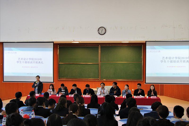 10月30日中午,2019年艺术设计学院学生干部培训班开班典礼在A2教学楼E301会议室隆重举行。学生处处长吴晓,学生处副处长、团委书记陈振应邀出席本次开班典礼,艺术设计学院副院长周建、叶克军,学工主管金亮,艺术设计学院全体辅导员参加了本次开班典礼及培训。参加典礼培训的还有艺术设计学院学生会全体成员、党员之家工作委员会全体成员以及18、19级全体班干部。开班典礼由金亮老师主持。 (图为出席本次大会的全体领导老师)会上,首先由金亮老师宣读艺术设计学院学生干部培训通知,通知中提出要进一步加强我院学生干部建设,提升学生干部的理论素养和工作能力,引领广大学生干部学习和掌握党的理论创新成果,自觉践行社会主义核心价值观,更好的发挥学生干部队伍在学校管理中的作用。随后,学生会主席张海龙宣读学生干部自律公约,要求学生干部们恪守学生本分,带头勤奋学习,彼此互相帮助,平等相待。 (图为金亮老师宣读艺术设计学院学生干部培训通知) (图为学生会主席张海龙宣读学生干部自律公约)接着,叶克军发表讲话,他介绍了学生干