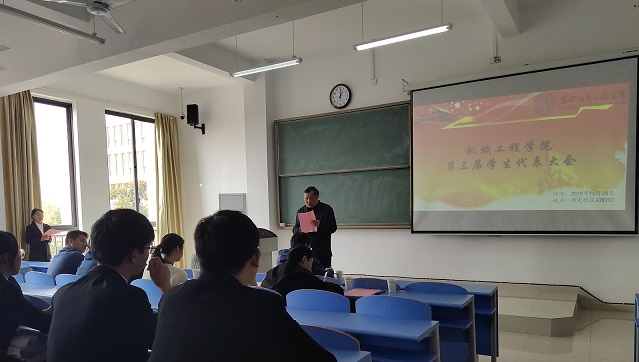 安徽信息工程学院机械工程学院第三届学生代表大会于2019年10月28 日12:50在A3教学楼W202教室成功举行,本次大会旨在选拔优秀的学生代表,更好的为同学们服务。出席本次会议的有机械工程学院党总支书记柴阜桐,党总支副书记柴知章,学生党支部书记王淼昕,学工秘书夏俊,党总支组织委员兼宣传委员常琳琳,学生党支部组织委员孙奇慧,学生党支部宣传委员苗思忠以及学院各位辅导员。(柴阜桐致辞)首先机械工程学院党总支书记柴阜桐为大会致辞,他表示学生代表是同学们表达自身想法,行使自己权利的重要途径,鼓励同学们积极参与学生代表的竞选,并希望在公平公正公开的原则下选出真正能代表最广大学生意愿的优秀学生代表。随后同学们仔细研究,认真斟酌,慎重的写下结果并将其放入投票箱。最后由王淼昕老师宣布投票结果,并宣读25名优秀代表名单,至此,机械工程学院第三届学生代表大会圆满结束。(学生投票)(王淼昕宣读结果)希望优秀的学生代表们可以尽心尽力地为同学服务、为班级服务、为机械工程学院服务,做好同学们的榜样,做一位名副其实