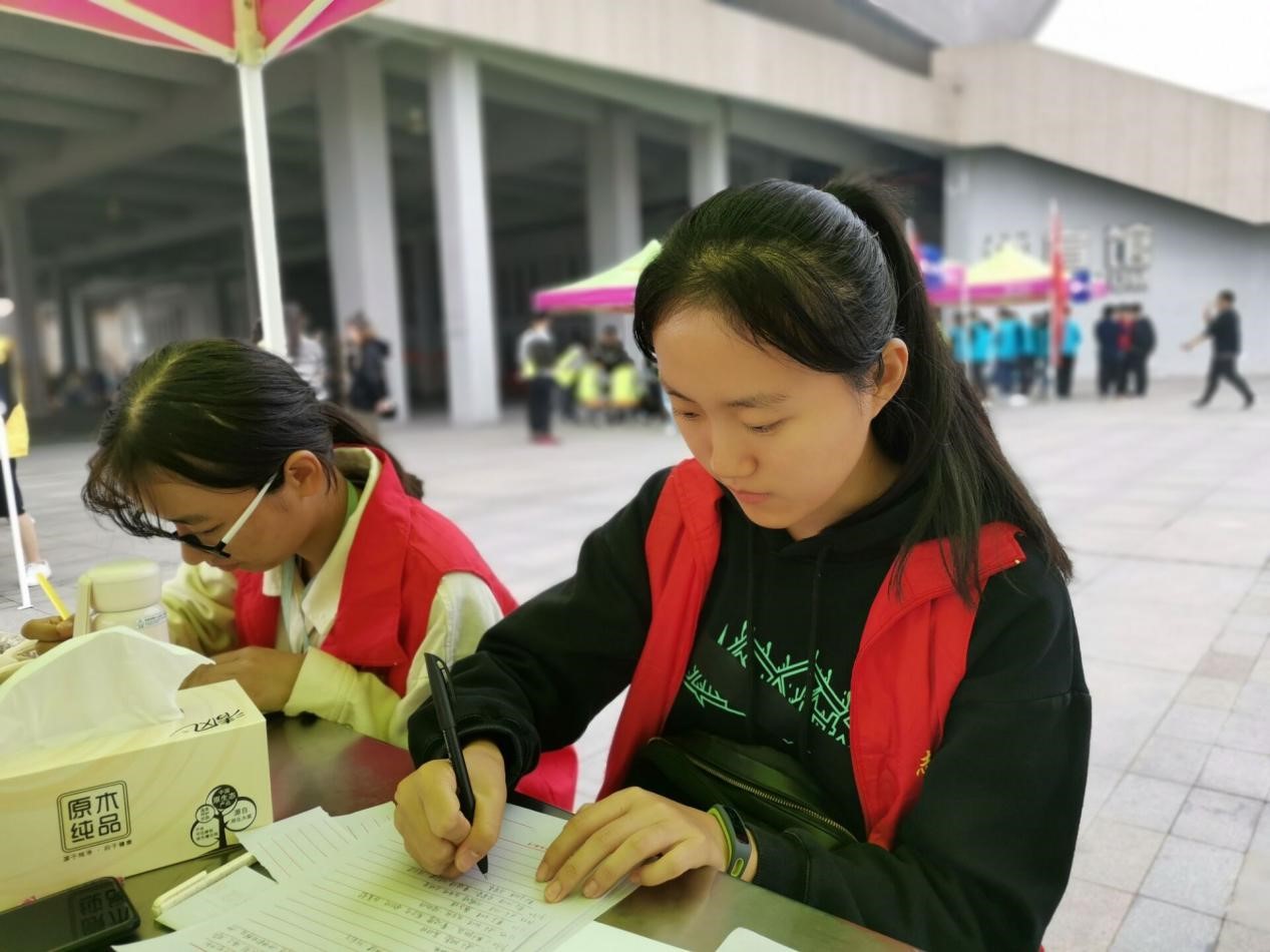 本网讯 2019年10月25日,安徽信息工程学院第七届秋季田径运动会正式拉开序幕。为了保证运动会的顺利进行以及为运动员提供强有力的后勤保障,弘扬“奉献、友爱、互助、进步”的青年志愿者精神,通识教育与外国语学院学生会于2019年10月25日开展了为期两天的志愿者活动。(志愿者在工作场地)25日上午七点三十分,在运动会还未开幕时,志愿者们就已来到了工作场地,为运动员准备好矿泉水、纸巾和椅子等,保证他们在比赛前能够充分保存体力,比赛后能够快速恢复体力。比赛正式开始后,志愿者们与运动员一起到检录口处,帮助他们整理号码牌,帮助运动员拿着衣服和矿泉水;当运动员上场比赛时,志愿者们在一旁安慰他们,为他们呐喊助威;比赛结束后,志愿者在第一时间里给他们递上一瓶水、一张纸巾,搀扶着他们到一旁休息。志愿者们为运动员做的事也许微不足道,但这些小事却真真切切地温暖了我们每个人的心,也成为了运动员在赛场上更加努力拼搏的动力之一。(志愿者正在为运动员整理号码牌)在运动会上,大放异彩的不仅仅是运动员们,还有那些默默无闻
