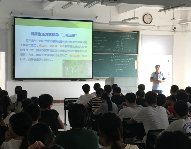 本网讯 9月,是全民健康生活方式宣传月。今年的主题是:三减三健,助力健康中国行动。三减三健,是减盐、减油、减糖,健康口腔、健康体重、健康骨骼。为进一步提高广大师生的健康意识,做好健康知识的宣传,引导大家作出健康生活的选择,9月25日,后勤管理处邀请医学专家来我校进行“三减三健,助力健康促进”健康教育知识讲座。本次讲座由我市第四人民医院精神科刘伟主任医师主讲,我校学生、教师、宿舍管理员及医务工作者共120人参加。刘主任介绍,随着人民生活水平不断提高以及生活方式的改变,居民膳食结构发生了巨大改变,肉制品、油、盐、糖、酒精等摄入过多,杂粮、蔬菜、膳食纤维等摄入偏低,导致近年来超重和肥胖人群不断增加,高血压、高血脂、高血糖等慢性病成为居民健康的头号公敌。因此,改变不良饮食习惯,倡导健康生活方式成为全民健康的出发点和根本点。(图为刘教授讲解'三减三健')讲座中,刘主任以饮食和健康作息方式为切入点,从一日三餐的搭配开始,让师生知道什么是“三减三健”,如何判断健康体重、健康口腔、健康骨骼,如何做到合理