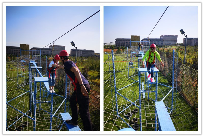 为隆重庆祝教师节和中秋节,进一步营造尊师重教、尊重知识、尊重人才的良好校园风尚,营造优良的教学氛围,强化教风建设,同时为加强我校教师队伍建设,进一步促进全校教育改革和发展,推动体验式教育方法普及,助力学校一流本科教育的发展目标,9月18日下午,校工会举办了素拓营地开放日活动。本次活动由通识教育与外国语学院大学生综合素质与能力培养中心承办,其通过一流的硬件设备和雄厚的师资力量,一直积极地为全校各专业的教职工和学生服务。本次活动也是一个重要的契机,通过展示体验教育的作用,以期在将来让体验教育和各专业结合,推动全校的教学改革。(中空五连环体验)当天活动面向全校教职工,以高空体验活动的形式,着力于锻炼教职工心理素质,体验素质拓展活动的乐趣,舒缓工作生活节奏,体会运动的快乐。首先是体验中空五连环项目,教师们身着全身式安全带,在空中断桥进行穿越。(我攀岩,我快乐)接着是攀岩活动,攀岩是从登山运动中衍生出来的竞技运动项目,现在已经成为奥运会项目。活动开始前,大家都摩拳擦掌,想尽快体验“空中芭蕾”。老师