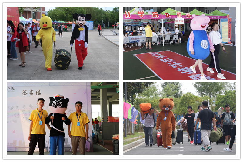 9月6日至7日,安徽信息工程学院2019年度迎新工作顺利开展,各学院为迎接新同学,各显其能,“大招”频出。可卖萌可卖力 卡通人物盛装出场当新生们乘坐校车来到安信工的文津校区时,刚一下车就被米老鼠和小黄鸡两位卡通人物“抢”走了行李,原来这是学长学姐们装扮成的卡通志愿者,目的是为新生及家长们的长途跋涉带来一丝欢笑,有的新生忍不住拿出手机拍下他们可爱的动作,还有人主动拉着他们合影。迎新期间室外温度并不低,表面上看去无比可爱的玩偶服装里,志愿者们早已汗如雨下,他们还要承担接送行李的职责,但大家轮换着穿,轮换着流汗,就是想为新生和家长们提供一场难忘的报到之行。无独有偶,新芜校区也有这样几位风靡全场的卡通志愿者,那就是大名鼎鼎的小猪佩奇、黑猫警长和小棕熊,他们站在报到点外,认真指引着来校新生到达准确的专业报到点。这些又卖萌又卖力的可爱志愿者们,成为了今年安信工迎新现场一道亮丽的风景。“校园导游”带你一览信工美电气与电子工程学院的新生们在完成报到流程后,在学长们的带领下,第一时间游览了安信工的新芜校区