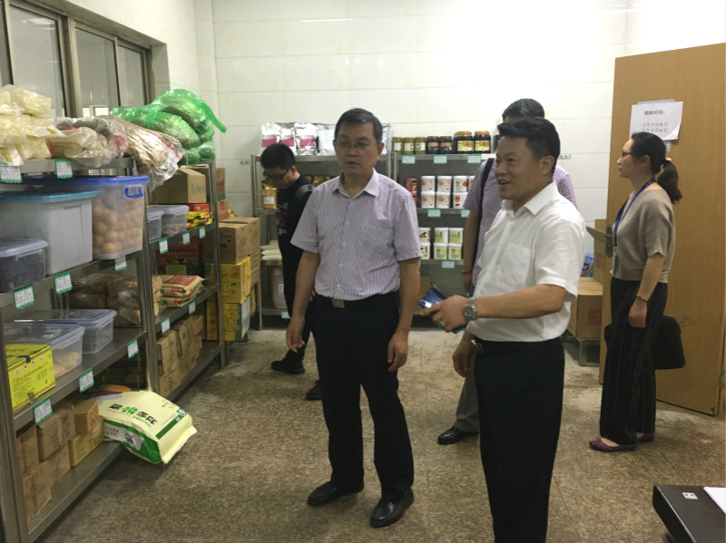 本网讯 9月4日,我校党委副书记、副校长程业涛带队,对校园秋季开学食品安全保障工作进行了专项检查和抽查。检查组一行先后检查了我校新芜校区优芙得餐厅、武汉华工餐厅、风味餐厅,文津校区上海东耀餐厅、亿诚餐厅。(检查组检查食堂仓库管理)(校领导抽查食堂猪肉两票)(检查组抽查食堂台账)现场细致询问、检查了各单位经营许可证照齐全情况,食品安全管理制度建立健全情况,从业人员健康体检情况,高风险食品原料及米、面、油等大宗食品物资采购、索证索票、入库存放、发放领用情况,泔水去向管理、食品加工设备、工具、容器、餐具清洗保洁和加工经营场所的卫生清洗消毒情况等落实情况,抽查了菜肴留样、原材料检验合格证明、从业人员健康证明、消毒记录等材料。程业涛强调,师生舌尖安全无小事。开学期间后勤管理处要继续强化管理,一是要增加对食堂食品安全的检查频次,特别是开学后一个月的专项检查。二是检查要突出重点,重点检查采购、交叉、留样、人员等关键点。三是检查中一旦发现有违规行为一定严肃处理。(检查组查看食堂食品安全制度健全情况)(