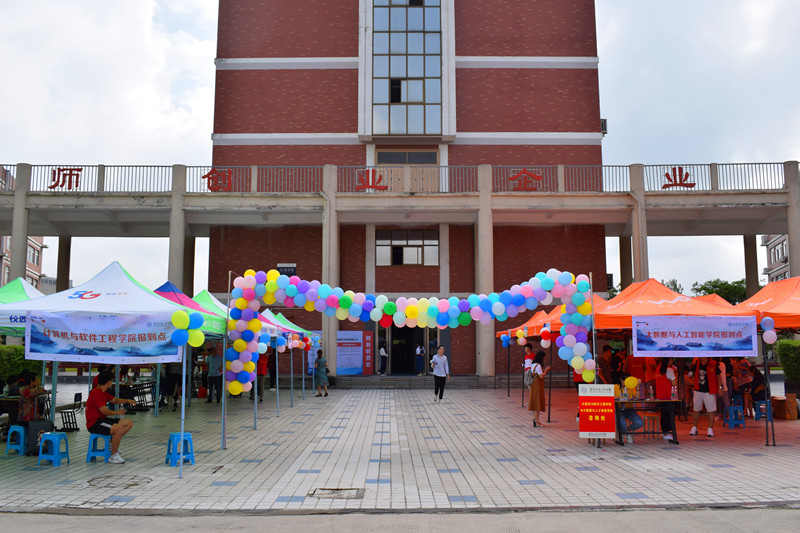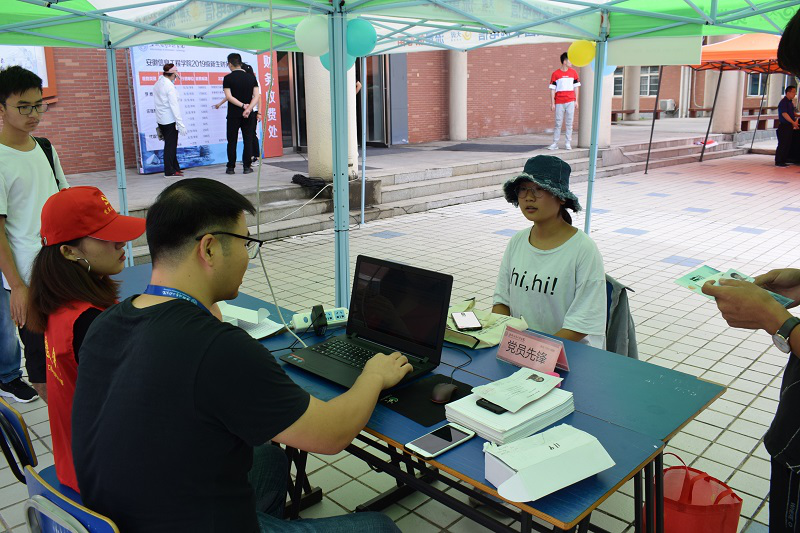 丹桂飘香,荷花满塘,又是一年迎新时。9月6日上午7时,学校迎新工作正式启动。一张张热情的笑脸,一句句亲切的问候,一项项贴心的服务,欢迎着来自祖国各地的莘莘学子。对于即将开始的大学生活,他们的内心或许忐忑不安、或许离家不舍、或许充满向往……但这些情绪,都融进一句话里:“初次相见,请多多关照。”(图为报名现场) 对于新生同学,学校也充满了期待与厚望。为了消除新生们初来乍到的陌生感,特别准备了“米老鼠,小黄鸭”的卡通人偶服,在欢声笑语中缓和对于新环境的羞涩;还有“‘我和我的国旗’同框,话题发博”活动上传在校园和国旗的合影照片或视频,将有机会被安信工官博转发,提升你的校园知名度,更有机会登上央视新闻;这值得纪念的日子,老师们还准备了“签名墙”记录你的心情,写下你的初心,乘上时光机,我们四年后再见! (图为学院特色迎新)迎新工作如火如荼,到处都是忙碌的身影。学长学姐们不厌其烦地给新生、家长回答着他们提出的各种问题。不少的学长学姐主动帮着拎行李,一路谈笑风生。新生细声地叫着“学长学姐”,老生们