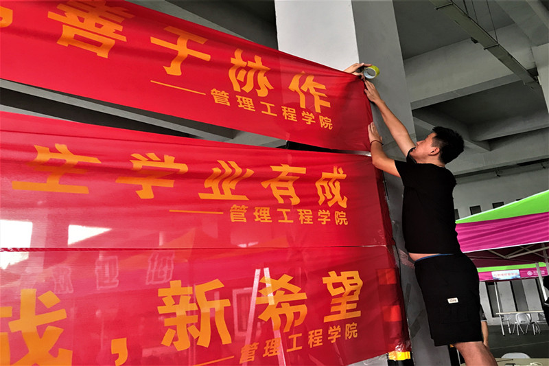 又是一年迎新季,每当这个时候,校园从上到下都是一片热闹的氛围,因为九月是学校的“萌新”们报到的日子。截至9月5日,管理工程学院各项迎新工作均准备就绪。学院从人员、物资、宣传等方面逐步落实,做到准备更提前、信息更全面,服务更到位。 为了迎接新生的到来,各年级辅导员联动,充分发挥学院学生组织和志愿者的先锋模范作用,为保证迎新各项工作的顺利完成和让新生感受到学院大家庭的温暖做了充分准备。 志愿者们在校园中如一道道美丽的风景,热情细心、有条不紊的布置迎新现场。体育馆一楼整齐划一的迎新现场布置,彰显出了管理工程学院的热情。19级的萌新们,我们在安信工等你哦! (布置桌椅)(悬挂横幅) (图、文/邹贤 核/邓辰 审/刘冰)