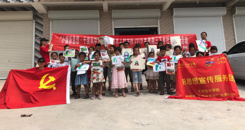 为深入学习贯彻习近平新时代中国特色社会主义思想和党的十九大精神,2019年7月15日,志愿服务团队来到泗县黑塔的一个儿童培训基地,无偿的帮助机构对孩子们进行辅导教育以及相关宣传。(图为志愿者和学生合影) 早上九点志愿者们来到机构事先做好准备工作,迎接孩子们的到来,给孩子们发放具有教育意义的海报,之后给孩子们简单的解释海报上的意义,让孩子们领会党的精神,了解党的伟大。再然后给孩子们观看党的十九大新时代,新思想的视频,进一步加深孩子们对于党的理解与对党的敬佩之心。 之后志愿者们围绕美丽中国建设和打好污染防治攻坚战为主题,带小朋友们进行绘画创作,创作方式以手绘,剪纸,拼接各种形式展现,以不同的方式,提高孩子们的动手能力,开发孩子们的想象力,在快乐轻松的氛围里与孩子们共同进步。 (图为教育服务绘画场景) 这次的暑期“三下乡”社会实践活动得到该地村民、机构等对我校大学生社会实践活动的高度评价。在工作学习中,培养学生把专业知识运用到实践中,培养了学生的专业技能,提升了学生的思想认识。