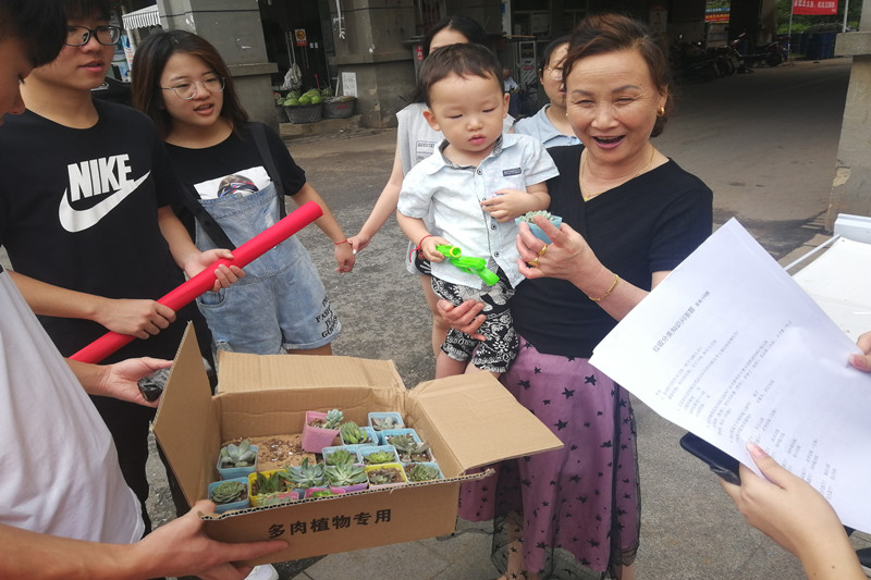为积极响应垃圾分类进社区的号召,2019年7月13日,电气与电子工程学院自动化1802团支部来到芜湖县城东社区,开展暑期三下乡志愿者活动。到达社区后,队员们积极向居民们讲解垃圾分类的有关知识。为了激发居民们对环保分类知识的学习兴趣,队员们还举行了“在线答题送绿植”的活动,得到了居民们的高度赞赏。人群中的一位培训班老师对队员们称赞道:“这是一次非常有意义的活动,目前有关垃圾分类的相关规定已经在很多城市实施,相信我们芜湖也会对垃圾分类有着严格的要求。保护环境,需要每一位公民的参与,有你们这样的倡导者真的很棒!”随后,在老师热情地邀请下,队员们来到了她任职的培训班进行参观和交流。课堂休息期间,团支书张雨化身小张老师,为孩子们上起了有关垃圾分类的小课堂,并进行课堂互动,向回答正确的孩子分发小礼品以示鼓励,深受小朋友的喜爱。(在线答题送绿植)(向小朋友宣传垃圾分类知识)此次活动很好地宣传了“垃圾分类为人人,做好分类为人人”的绿色环保理念,有助于引导社区居民积极参与到垃圾分类的行动中,从而让