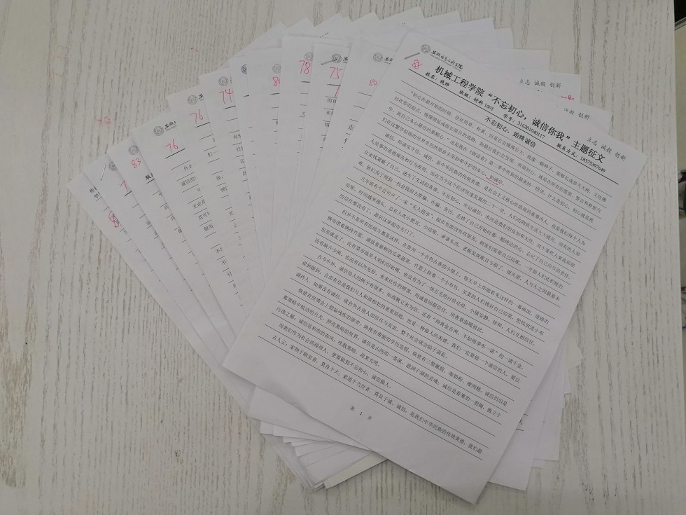 为增强大学生诚信意识,提高大学生综合素质,引导学生树立诚信观念,按照习近平总书记提出的“努力成为理想远大、信念坚定的新一代,品德高尚、意志顽强的新一代,视野开阔、知识丰富的新一代,开拓进取、艰苦创业的新一代”的讲话精神,不忘初心,牢记使命。机械工程学院学生党支部于2019年5月举办2018-2019学年春季学期“不忘初心,诚信你我”主题征文活动。本次诚信主题征文活动共收到稿件30余篇。投稿学生以不同的视角,讲述与诚信相关的故事与见解,内容涵盖资助诚信、考试诚信、学术诚信等,阐述了对学校、对家庭、对社会的认识,文情并茂,较好地体现了大学生积极进取、奋发学习、自立自强、诚信感恩、成长成才的精神风貌。比赛共评出一等奖一名,二等奖两名,三等奖三名。(征文比赛部分稿件)通过此次征文比赛, 既使同学们明白了讲诚信是做人的基石,是国家建设的重要保障,又有助于我院学生树立社会主义核心价值观,培养诚实信用的道德观,而且对营造文明校园文化氛围起到了积极作用。(文、图/周超 校、审/孙奇慧)