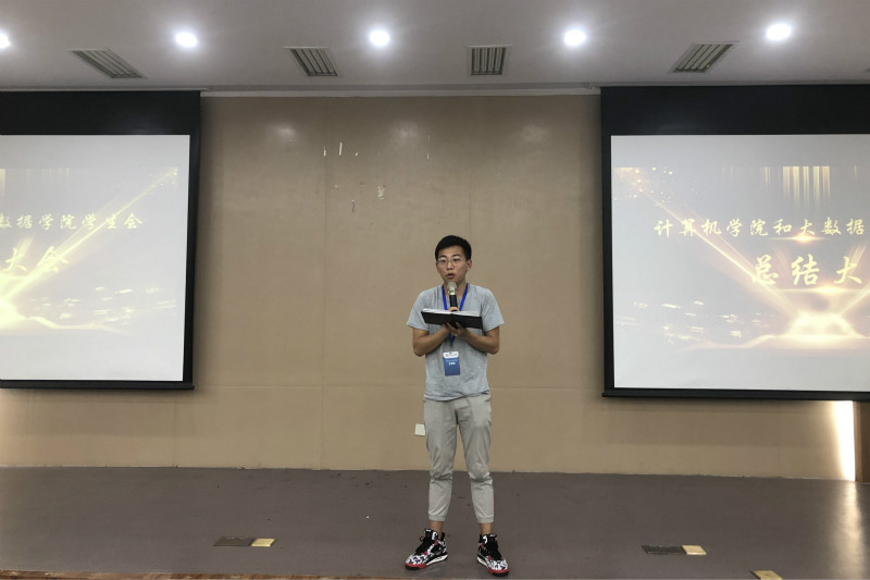 静看光阴荏苒,六月已然在裹藏在浓郁的香樟气息之中走来。计算机学院学生会和大数据学院学生会2018-2019学年的工作逐渐步入尾声,学生会年度工作总结大会于2019年6月2日晚,在东二五楼报告厅隆重召开。学院团总支书记夏林老师以及学生会全体成员参加了会议。(图为副主席杨康上台发言)(图为张士许主席上台发言) (图为夏林老师做总结发言)会上,首先播放了学生会年度工作总结视频。3分42秒的视频,包含着学生会全体成员一整年的光辉时刻。随后,学生会主席团助理杨康上台发言,杨康结合自身经历,提醒学生会成员们要抓住机遇与挑战,有不负勇往的决心与果断,并要努力提升自己。学生会主席张士许结合亲身实习经历,告诉同学们要珍惜在校时间,多学习一些技能,以便将来走到工作岗位能更加优秀。夏林老师用“三思”勉励同学们明确自己的目标,希望学生会的每一位成员都能记住进入学生会这一年以来的美好时光。会议最后,由夏林老师为本学年度计算机学院和大数据学院学生会优秀委员颁发荣誉证书。证书颁发完毕,本次总结大会在全体与会人员的合影
