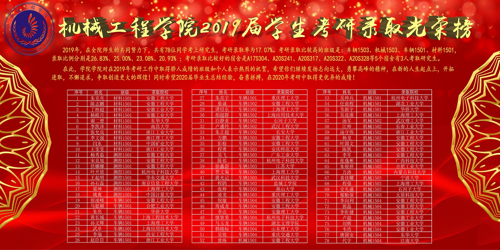 4月底,2019年全国硕士研究生录取工作已经全部结束,我校机械工程学院考研升学取得重大突破。据统计,共有78位同学获得高校硕士研究生入学资格,录取同学占全院毕业生17.07%,考研录取率同比增长5.67%,远超学校既定的升学指标,取得历史性突破。近几年,为帮助指导学生考研,机械工程学院坚持“引导、督导、指导”的六字方针,组织开展了大学生“成长、成人、成才、成功”主题教育活动,构建起全程、全员、全方位育人的大思政工作格局,积极营造优良学风;同时,着重开好“考研工作研讨会、考研经验交流会、考研工作推进会、考研复试调剂指导会”等系列会议,从而为考研学生从起点到终点提供卓有成效的全程服务,及时地帮助学生解决各种困惑,考研升学率逐年攀升。2019年机械工程学院共有毕业生457人,其中有200位同学报考研究生,报考率为43.76%;最终录取78人,报考录取率为39%,其中,考入合肥工业大学、武汉理工、长安大学、江南大学、东华大学、南昌大学等机械专业211重点高校11人。同时,也涌现出以朱正超、闫东为