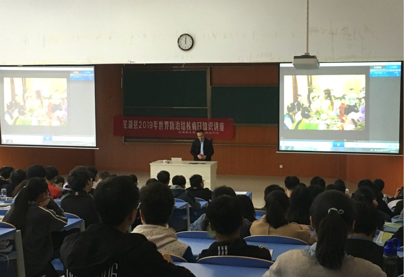 本网讯 3月27日下午2点,我校在新芜校区A2教学楼E301教室举办防治结核病健康知识讲座,讲座主题为《学校结核病的防治举措》。我校学工代表、医护人员、在校学生和物业宿管员共240余人聆听了讲座。据活动承办人校医务室徐萍老师介绍,本次讲座由来自芜湖市、县两级疾病防控中心的3名医务人员组成讲解团,担任主讲的彭伟医生现任芜湖市疾病控制中心结防科科长,是一名在疾控防治一线上战斗了20多年的医务工作者,经验丰富。首先,彭伟医生开宗明义地从结核病的特征导入讲座主题,用生动的事例,详实的数据以及直观的图片,深入浅出地讲解了结核病的致病原理、发病状况、传播途径等相关知识。(讲座现场1)随后,彭伟医生结合高校的实情与特点,向在校学生、学工教师、宿管阿姨、校医护人员四个代表性听众人群,列举了个人卫生习惯、学工关注要点、宿舍点检流程、医务管控处置等结核病防治措施。(讲座现场2)最后,彭伟医生与讲解团其他医生共同回答了现场师生的咨询。通过讲解与交流,使师生对如何预防结核病等问题有了全面、科学的认识,消除了对结