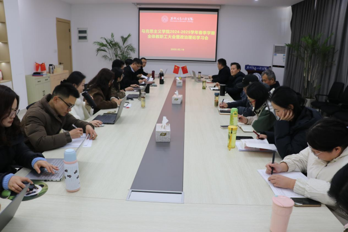 蛇衔春信至,岁序又更新。为进一步提升学院教职工的政治理论水平,凝聚思想共识,推动学院高质量发展,马克思主义学院于2月19日下午在A1N502开展了新学期全体教职工大会暨政治理论学习会。学院全体教职工参会,会议由马克思主义学院常务副院长胡安全教授主持。(图为会议现场)会议伊始,由学院党支部副书记任晨晨领学习近平总书记在二十届中央纪委四次全会上的重要讲话精神。习近平总书记的讲话以高远的历史眼光深刻把握反腐败斗争基本规律,深刻分析当前反腐败斗争形势,对坚决打好反腐败斗争攻坚战、持久战、总体战提出明确要求,对深入推进全面从严治党作出战略部署。任晨晨提出,全体思政课教师要常怀忠诚之心,坚定理想信念,在教学和科研工作中发挥党员的先锋模范作用,要勇于担当,乐于奉献,始终树立廉洁意识,为学院和学校的发展做出积极努力。 (图为任晨晨领学教职工政治理论学习会)随后,胡安全对学院2024年工作进行全面总结。他从年度绩效考核、教科研项目申报、学校重要文件等方面展开,对2024年学院取得的各项成绩给予充分的肯定。
