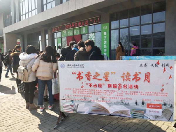 本网讯 2018年12月18日中午12时,为提高图书馆座位利用率,杜绝不文明占座现象,由读者协会承办的图书馆“不占座”横幅签名活动在陶然餐厅门口顺利开展并圆满完成。本次签名活动推出的“不占座”座位管理系统,使来馆读者通过扫描阅览桌上粘贴的二维码便能实现占座、座位保护等功能,从而告别占座时代。随着“不占座”的横幅在陶然餐厅门口拉开,我们的工作人员为到场读者们细心讲解着“不占座”所带来的福利。本次活动得到了很大的反响,同学们纷纷吐槽着自己的座位困扰。活动过程中,我们送出了精美的书签,同学们也十分积极的签下了自己的姓名,表示了对图书馆这一措施的赞成。此次活动不仅让读者了解了“不占座”的使用规则,也避免了同学之间为占座而制造的矛盾。图书馆致力于为读者持续改善学习环境,也希冀各位读者为图书馆的秩序管理贡献出自己的力量,支持图书馆“不占座”管理系统。(火爆的活动现场)(同学们排队在“不占座”横幅上签字) (同学们认真聆听“不占座”系统使用方法) (文/朱文强 图/杨悦 核/夏苗苗 审/程玉林)