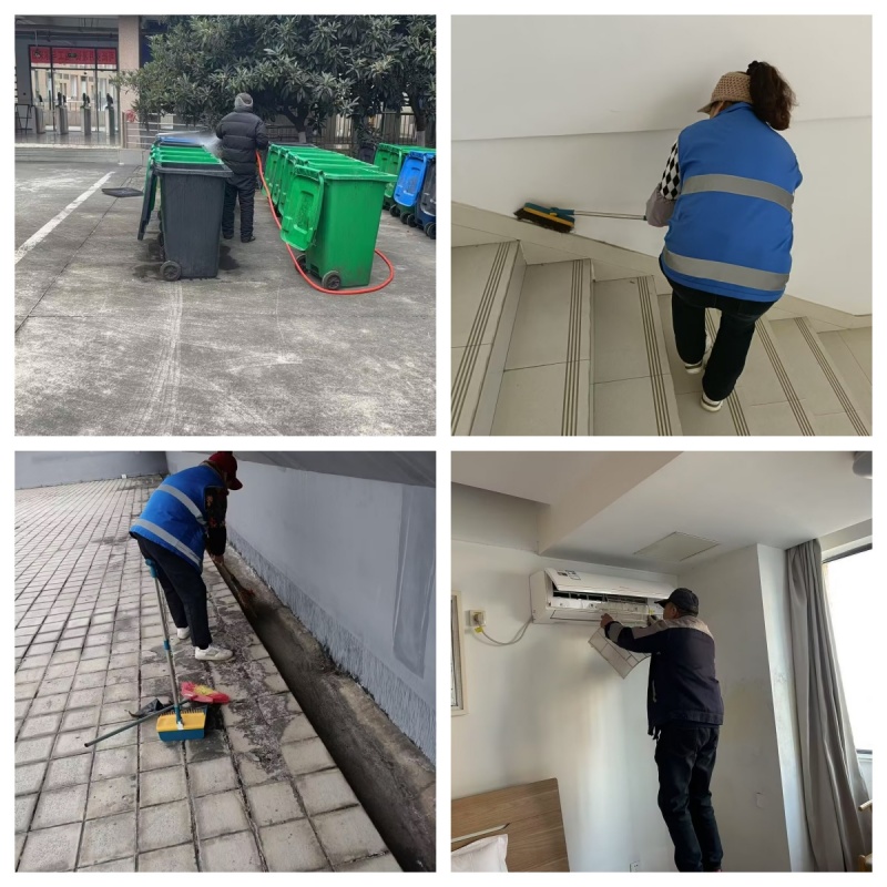 为进一步优化学校的教学与生活环境,抢抓“寒假黄金窗口期”,后勤管理处一线工作人员在寒假期间坚守岗位,以实干笃定前进步伐,扎实推进各项服务保障工作,全面提升后勤保障服务水平。牢抓校园安全,开展楼宇综合整治后勤管理处联合昭阳物业全面启动楼宇环境综合整治行动,此次行动涵盖了深度消毒清理垃圾桶,有序封闭宿舍楼,检修宿舍公共区域,以及对招待房开展精细化清洁工作,全面排查了楼宇环境中可能存在的安全隐患,为新学期提升校园楼宇环境提供了有力保障。(图为工作人员开展楼宇保洁、空调滤网清洗等工作)紧盯维修进度,夯实后勤基础保障寒假期间,后勤管理处组织对校内各类公共设施进行了全面细致检查,有序排查检修学生宿舍的水电系统、公共教学楼的桌椅门窗,深入推进室外的化粪池、室内的空调滤网清理工作。同时,后勤组织施工单位开展A32西侧污水管道渗漏、A31北侧废水管道堵塞等5处紧急抢修,以及艺术楼地坪漆维修、校园绿化带施工改造等零星维修工程施工。通过切实有效的措施,提升校园设施的安全性和稳定性,为新学期的教学科研工作提供有