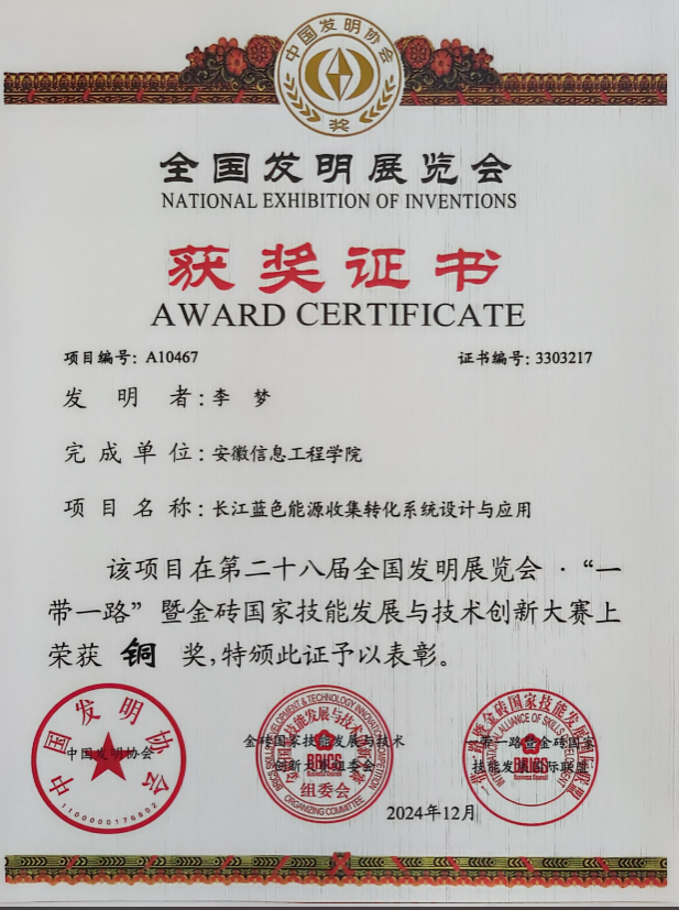 本网讯 近日,第二十八届全国发明展览会·“一带一路”暨金砖国家技能发展与技术创新大赛在中山市小榄镇落下帷幕。我校机械工程学院李梦老师的发明专利《长江蓝色能源收集转化系统设计与应用》斩获铜奖。(获奖证书) (参展文件)李梦老师的作品《长江蓝色能源收集转化系统设计与应用》是针对现有水波能发电装置存在的不足,设计和研发的基于摩擦纳米发电机的江河波浪能收集系统,优化技术成熟度,提升系统的环境适应性和稳定性,并验证其在大规模收集低频蓝色能源方面的应用潜力。据悉,全国发明展览会迄今已成功举办27届,展示发明成果近10万项。本届展会由中国发明协会、金砖国家工商理事会中方理事会主办,展会主题是“智汇中山、绽放湾区”,共有7个馆,展览面积一万多平米,来自全国各地400多家企业和科研机构和学校、近千个发明创新项目现场展示,包括世界500强大型央企、独角兽企业、知名高校、科研院所、中医药企业、低空经济企业、中小学校等,经网上和现场评审,最终共有696个项目获得“发明展览会奖”,其中金奖204项,银奖231项,
