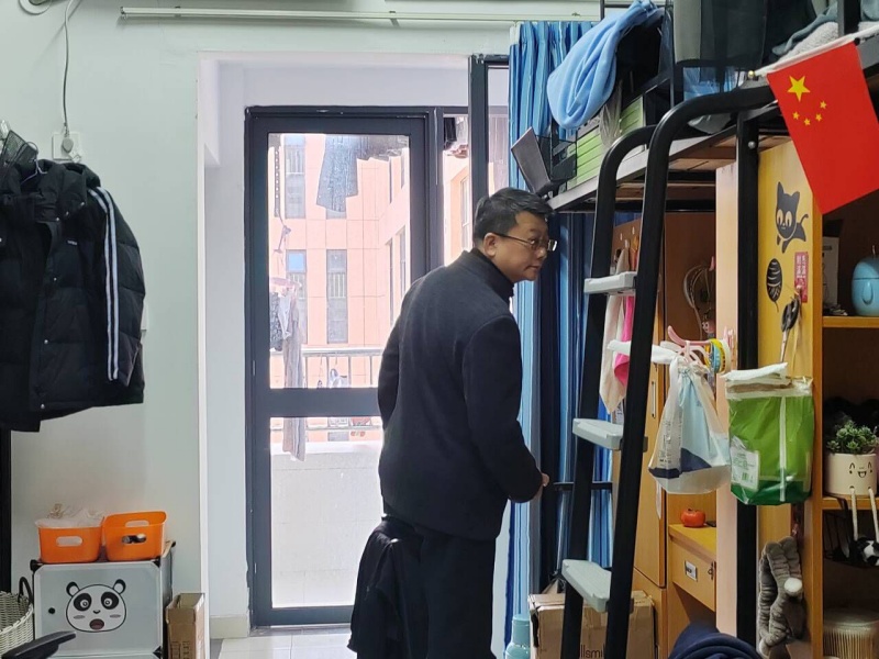 为进一步加强学生宿舍安全用电常态化管理,预防和减少安全事故的发生,12月25日下午,后勤管理处联合各学院、学生处(团委)及保卫处共同开展了一次针对学生宿舍冬季安全用电的专项检查。此次检查分为71个小组,覆盖10栋楼宇,3700余间宿舍。检查组深入学生宿舍,重点排查了线路老化、裸露、私拉电线及私自接电使用公区电源等问题,同时严查违规使用电磁炉、电饭煲等电器设备行为。此外,还对宿舍内是否存在焚烧物品或乱丢烟蒂的现象进行了严格检查,并仔细查看了各类插座、漏电保护器的状态,确保无发黄、烧焦现象。排查走访中,检查人员细致评估了宿舍卫生状况及学生卫生习惯,并现场向同学们讲解了违规使用大功率电器的危害,宣传了冬季安全用电知识,提醒同学们要遵守学校宿舍管理规定,从源头上杜绝用电安全事故发生。大部分被检宿舍用电规范、室内整洁,同学们具有较强的安全意识和良好的卫生习惯。对个别存在安全隐患的风险点和卫生不佳的宿舍,检查组现场进行了指正,并给予相应教育指导。(图为宿舍安全检查现场)校园安全工作无小事。为确保本次