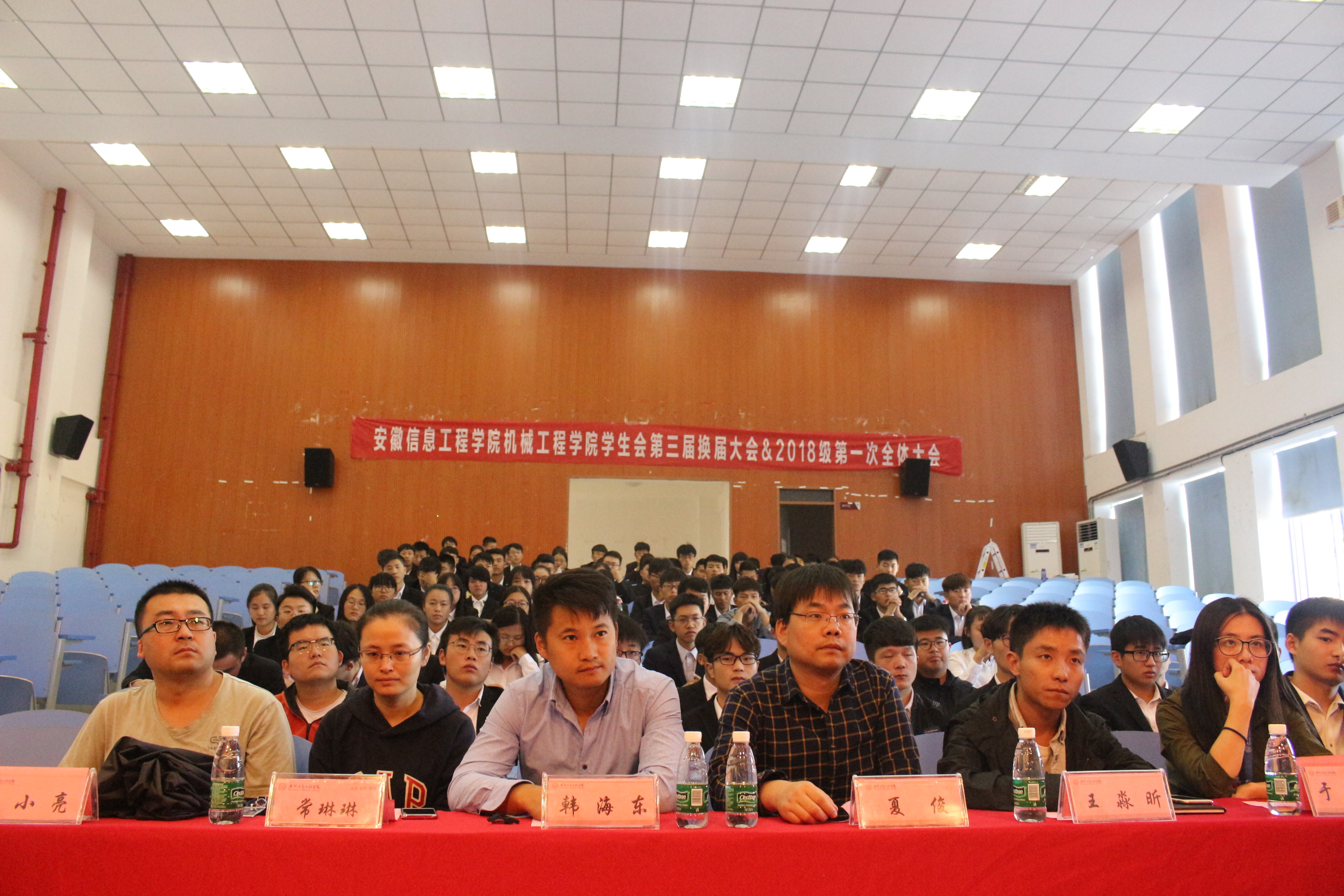 2018年10月10日13:30,机械工程学院学生会第三届换届大会暨2018年第一次全体大会在新芜校区A2教学楼E101教室顺利召开。我院学工秘书夏俊、团总支书记王淼昕,以及李小亮、于凯烁、常琳琳、韩海东等多位老师出席本次大会,学生会全体成员参加大会。大会首先由夏俊、王淼昕、常琳琳、韩海东老师为上届学生会成员颁发聘书,夏俊随后发言,表达了对上届学生会成员的感谢,并对本届学生会新成员的到来表示热烈欢迎,希望新成员能继续秉承“自我管理,自我服务,自我教育”的宗旨,为学生会的发展贡献自己的一份力量。接着,老生代表材料1602刘心悦发言,她谈了学生会工作给自己带来的经验教训和收获,也表达了自己对新成员的美好祝福。新生代表机电1803崔雨杰发言,她对自己能成为学生会的一员表示很开心,并强调,此后会更加严格要求自己,真正做到有组织、有纪律,时刻铭记自己的职责。大会后半程,学生会八个部门依次进行部门述职报告,介绍各部门的成员、职责以及取得的成就和存在的不足。最后,学生会上一任副主席王永超和现任主席赵兵