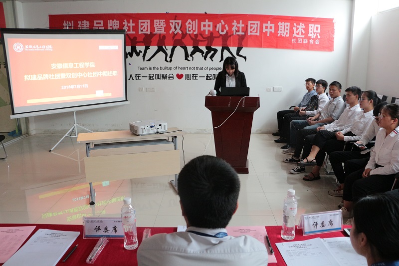 2018年7月11日下午13时,我校“拟建品牌社团”暨“双创中心社团”中期述职报告会在新芜校区A20会议室成功举行。出席本次述职报告会的有:学生处副处长兼团委书记陈振、团委老师章庆林 、团委老师严路路、计算机与软件工程学院团总支书记夏林、艺术设计学院老师范一鹏。参与本次述职报告会共有14个社团(含分室)。(图为述职现场) 会议伊始,陈振发表讲话,他首先充分肯定了学生社团干部对于校园文化建设的重要贡献,同时也表达了对接下来社团工作的美好期望。希望他们无论是在学习还是工作中,都能作为学校社团的领头羊,都能够延续学生干部负责敢闯的精神,进一步建立规范的社团管理责任体系,理顺各社团管理组织建设,逐步形成科学化管理、制度化运作、项目化运营的新型社团管理模式。(图为陈振发表讲话) 述职报告共分为述职和答辩两个环节。大家分别通过ppt说明了一年来的所做所学所思所想,在工作经验中总结收获和不足,并提出了相应的改进措施,一张张照片也让大家重温了上学年并肩战斗的温暖时光。更有电子科技协会