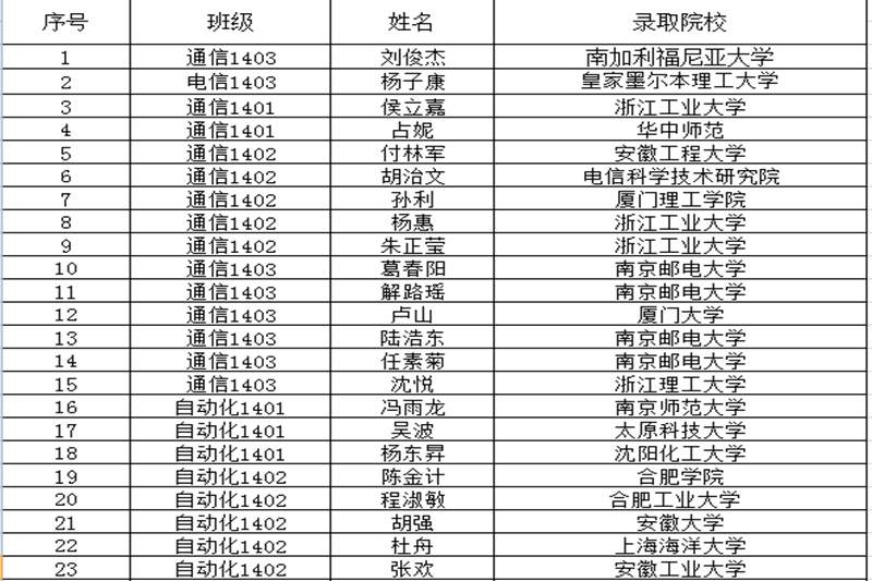 2018年硕士研究生录取工作已结束,我院考研成绩喜人,共有49名同学被国内外各大院校录取,录取率达8.7%,其中刘俊杰和杨子康同学顺利进入美国南加利福尼亚大学和皇家墨尔本理工大学深造。