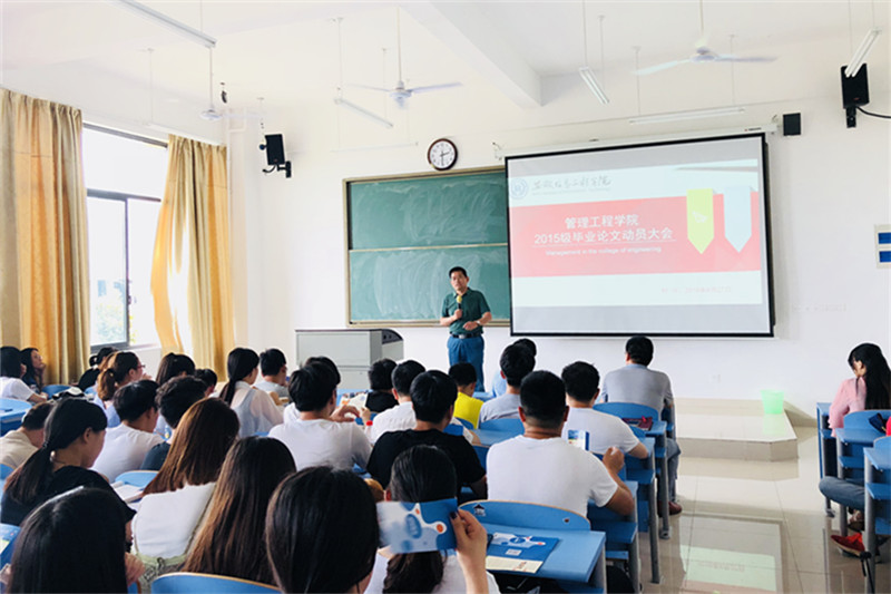 为了推进学生实习和毕业论文工作的顺利开展,管理工程学院于2018年6月25日在A3S205教室召开了2015级学生实习及毕业论文动员大会。管理工程学院副院长曹长芳、院长助理何塍兴、所有论文指导老师、15级辅导员曹媛及学生参加了本次大会。会议开始,曹长芳从我院导师制的实施,实习与毕业论文指导老师的安排以及学生的分组情况等方面做了动员讲话。他强调我院高度重视学生实习和毕业论文工作,他希望所有同学在实习期间严格遵守学校及实习单位规章制度,注意人身安全,克服工作困难,发扬“工匠精神”,实现能力与思想的双重境界提升,并且,注意积累数据和总结工作经验,为后期论文写作打好基础。接着,何塍兴针对本次实习做了一个简单报告,报告中提到,学生实习是一次很好的把专业理论知识与实践相结合的机会,希望大家能够认真对待,他告诉同学们要“回归常识、回归本心、回归初心、回归梦想”。然后,各位指导老师和辅导员曹媛为同学们详细阐述了实习相关事项,对实习作业的内容、实习体现形式等问题作了安排与布置,并提出了具体要求。同时,夏绍