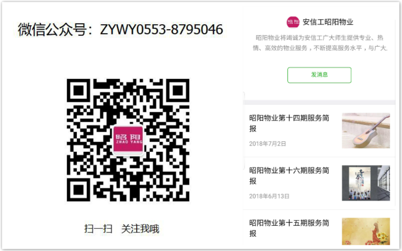本网讯 7月1日,新芜校区物业服务中心安徽昭阳物业微信公众号正式上线,目前该平台处于试运行阶段。为更好地服务保障师生、响应学校一站式便利物业服务体系建设号召,增强校园物业服务的透明度和便利化。在后勤管理处积极推动下,新芜物业服务中心积极探索物业服务新渠道,紧跟移动互联网浪潮,搭建“安信工昭阳物业”微信公众号,师生可在线了解物业服务动态、咨询校园物业服务。试运行阶段,新芜物业服务中心将不断根据师生需求,针对存在的不足和师生提出的合理化建议和意见完善微信公众号的服务内容、模块设置等,力争创建一个图文并茂、服务便捷、反应快速、处理及时的微信服务公众平台。(图为微信公众号二维码及页面)(文、图/王海波 校/骆军、张抒娟 审/张援全)