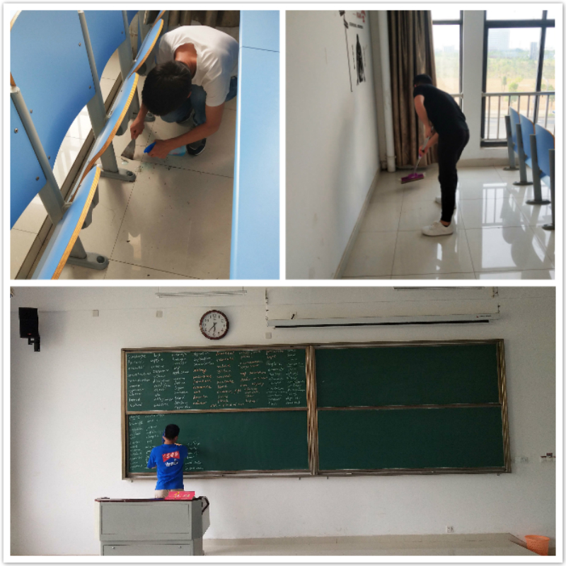 本网讯 为了给同学们营造一个整洁卫生的考试环境,做好考试周、CET英语考试、全国计算机等级考试等考场卫生保障,我校勤工助学组织校洁会组织开展考场卫生集中清扫活动分别对两校区教学区考场进行了全面的大扫除。本次活动内容主要是打扫教室地板、窗户、课桌及讲台。在进行简单的任务分配之后,大家情绪高涨,撸起袖子,拿起拖把,埋头苦干,有条不紊地清扫教室的每一个角落,或是收集垃圾,或是擦亮黑板。清扫过后的教室一尘不染、焕然一新。(同学们正有条不紊地打扫教室)每一间光鲜亮丽的教室背后都有默默为之付出的劳动者,尽管汗流满面,却为考生们带来全新的考场环境。最后,同学们对每间教室进行检查,对遗漏的区域重新进行打扫。(打扫后的教室)(文、图/曹林 改/王德鸣 校/张抒娟 审/张援全)
