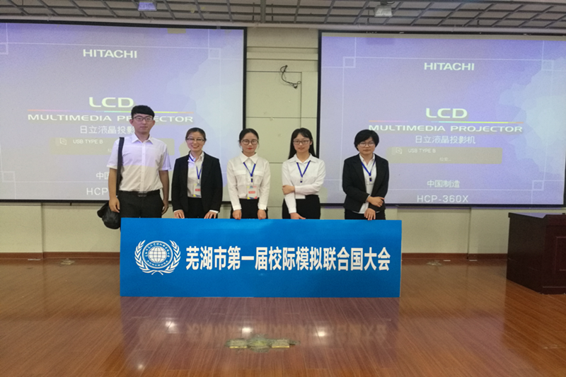 本网讯 2018年6月8日至9日,在我校祁亚伟老师的指导和带领下,基础教学部英语专业与电气与电子工程学院通信工程专业学生,分别代表英文场和中文场,参加了为期两天的“芜湖市第一届模拟联合国大会”,与来自安徽师范大学、合肥工业大学、安徽工程大学等高校的学生进行了一场充满智慧与激情的比拼。此次大会基础部学子表现优异,包揽了8个奖项中的3项。荣昱获得“最佳立场文件奖”,吴三绿和肖园园获得“最佳角色扮演奖”;电气与电子工程学院孙源和周梦雅获得“杰出代表团队”的称号。(基础部参赛学生与指导教师祁亚伟合影) 6月8日上午9时,“第一届模拟联合国大会”在安徽师范大学花津校区外国语学院第一会议厅开幕。在此次大会上,几位同学分别代表不同“国家”与其他“国家”代表唇枪舌剑、斗智斗勇,坚定地表明代表国的态度和立场,为代表国谋得利益最大化,展现了安信工学子的风采。在英文会场,荣昱代表苏丹、吴三绿代表以色列、肖园园代表肯尼亚。她们用铿锵有力的发言,淋漓尽致地展现了中东国家与第三世界国家对全球气候变暖这一议题的