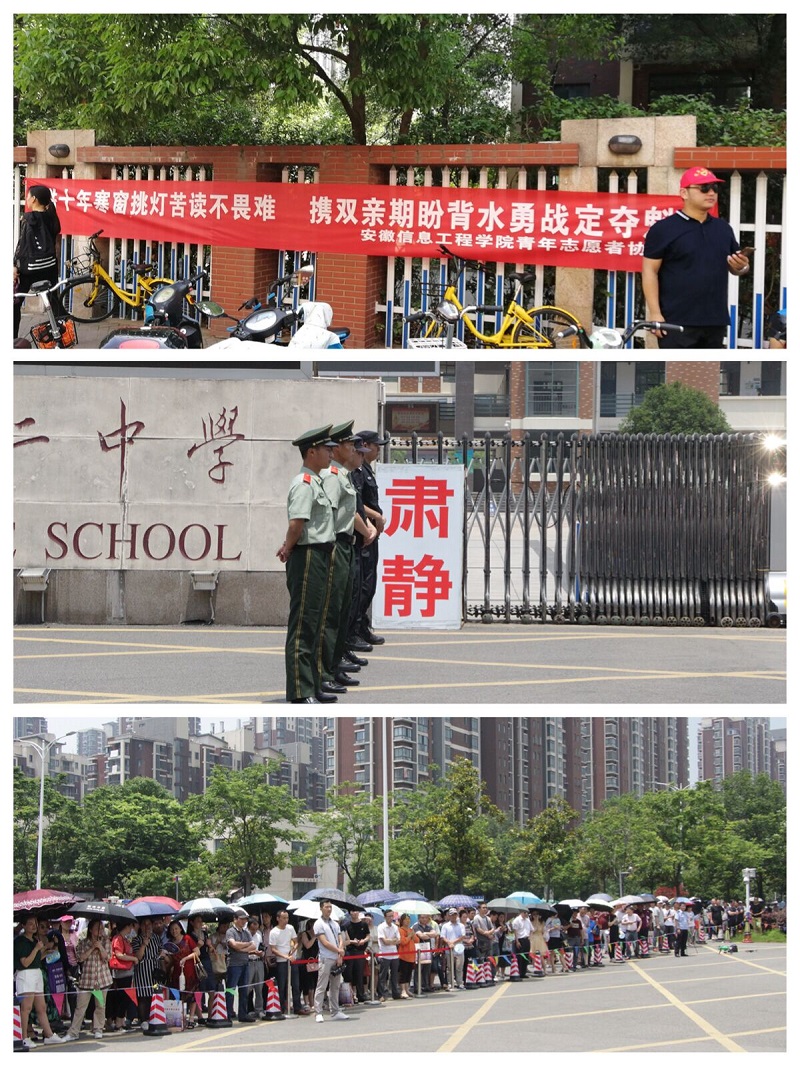 题记:“十年磨一剑,一朝试锋芒。”一年一度的高考大幕再次拉开,又一批寒窗苦读的学子奔赴考场。考生心中跃动希望,家长心中期盼平安。以良好的身心状态奔赴高考,取得佳绩,是每个高考学子的梦想。考场内,莘莘学子挥笔如飞冷静答题,考场外,有心急如焚静静等候的家长,也有一群统一身着“安徽信息工程学院青年志愿者”马甲和绶带的同学们用实际行动温暖着应考学子和考生家长的心。 本着“奉献、友爱、互助、进步”的志愿服务精神,彰显对高考考生的关心和支持,6月7-8日,“志愿服务高考 爱心助力学子”活动在芜湖市第十二中学考点火热举行。我校青年志愿者们以自己的实际行动为高考学子顺利考试保驾护航。此次活动得到了芜湖市弋江区城管局、鲁港街道办事处、中央城社区居委会的大力支持。 (图为芜湖市第十二中学考点现场) 第一天考场的气氛静谧而紧张,志愿者们早早来到考点,分工明确,各司其职。我校志愿者们在考生入场、出场时段打出“高考加油”条幅为考生加油打气,此外还为广大考生和家长免费提供了爱心饮用水、纸巾、考