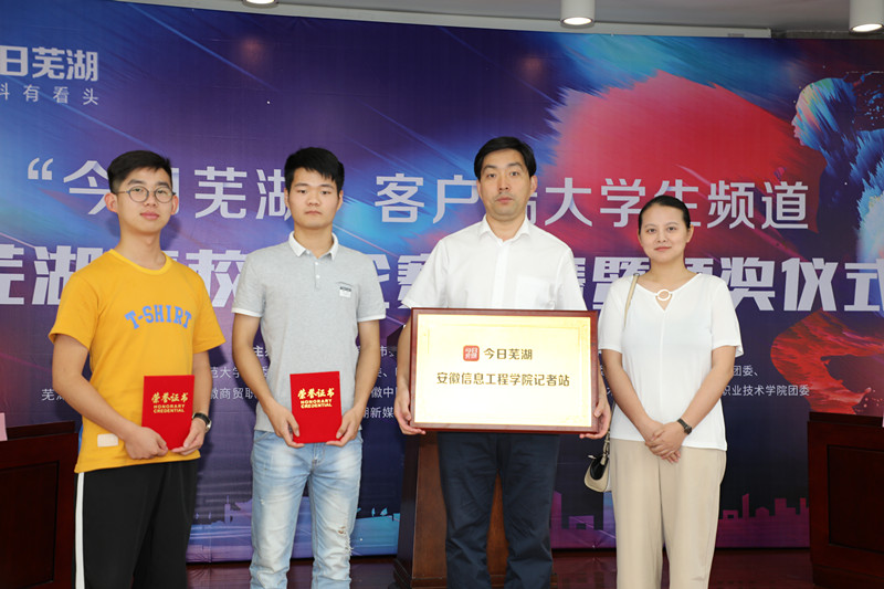 本网讯 6月10日下午,“今日芜湖”高校辩论赛颁奖仪式在芜湖报业集团大楼举行。我校学子代表学校参赛并取得良好成绩,两支参赛队伍分别获得“最佳组织奖”和“精神文明奖”,其中来自计算机与软件工程学院的软件1603刘仔强同学凭借敏捷的思维逻辑、流利的口语表达从60名辩手中脱颖而出,在大众投票环节位列第一,获得“最佳辩手”称号。颁奖仪式结束后,“今日芜湖”还为安徽信息工程学院、安徽工程大学、安徽商贸职业技术学院三所学校进行 “今日芜湖”记者站授牌仪式,我校学生处副处长兼团委书记陈振接牌。据悉,“今日芜湖”驻安徽信息工程学院记者站将以在校学生为主,以今日芜湖APP为平台,更好地助力学院树形象、扩影响、促宣传。(陈振与获奖辩手合影)(最佳辩手刘仔强)(文/张磊 图/褚其岭 审/褚其岭)