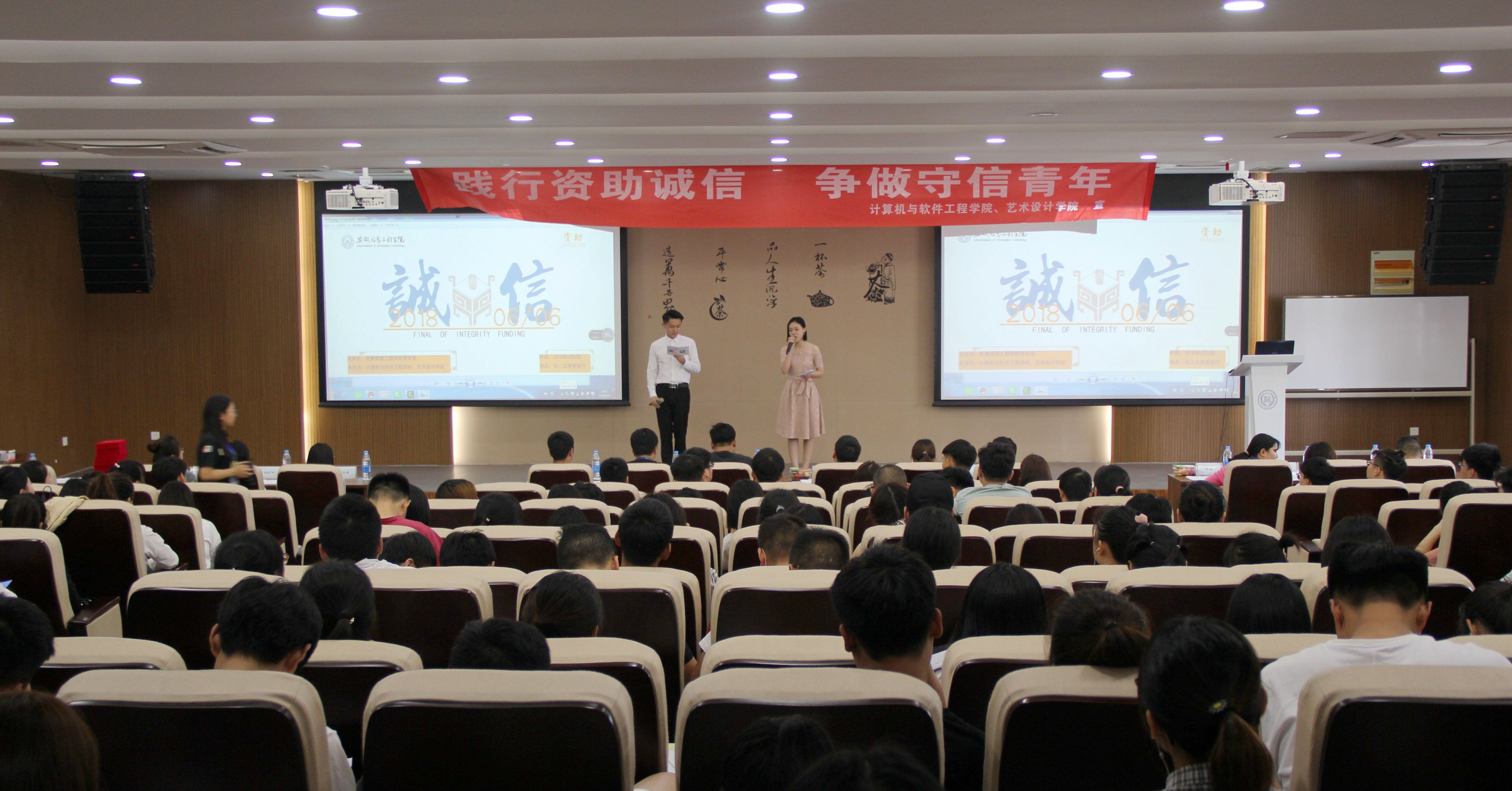 为进一步提高大学生的诚信意识,增强大学生的信用观念。6月6日下午14点,由学生处主办,艺术设计学院、计算机与软件工程学院共同承办的诚信资助大赛决赛在文津校区东二五楼报告厅拉开帷幕。本次大赛邀请了学生处副处长吴晓、艺术设计学院党总支副书记叶克军、计算机与软件工程学院学工秘书张齐云、学生处潘经健老师以及来自艺术和计算机学院的各位辅导员老师担当评委。(图为决赛现场)活动自启动以来持续了近一个月时间,分为初赛与决赛两个阶段,内容涵盖了资助诚信教育主题知识竞赛、诚信资助签名活动和诚信资助主题表演活动。 (图为初赛考试现场)比赛伊始,评委老师就表演技巧、舞台形象、主题思想等评分要点加以强调,明确了演绎方向。随后,选手们依次上台,有的将各类形式的舞蹈与改编歌曲完美融合, 特色明显;有的默契演绎小品,滑稽搞怪的神情、灵动活现的肢体语言,为在场观众带来了一场视听盛宴。经过了激烈的角逐,最终繁衍计划、rj-Dy、诚心之队荣获一等奖,诚信为本、梦想之星、LLL队、Team队、太阳、城管队荣获二等奖,大嘴猴、地