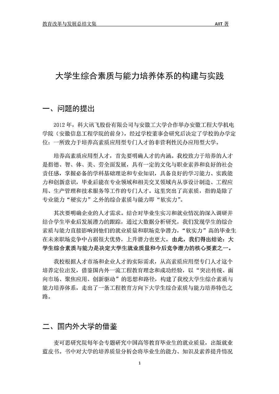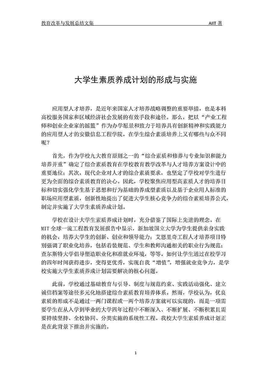 C=(K+S)×Q,一道看起来简单的公式,却是安徽信息工程学院创新性人才素质培养理念的高度概括,对全校学生的成长成才有重要影响,意义深远,享用终生。(安信工独有的竞争力倍增公式图)大学时期学生的心智处于向成年人过渡阶段,无论其思想品格还是言行规范,还不够稳定,同时这个阶段是一个自然人向社会人、职业人过渡的特殊阶段,在此阶段对大学生的“思想品行”“举止修养”“职业素养”进行塑造及培养,能够促使大家遵守公德、严于律己、礼貌待人,养成良好的道德品格、行为习惯和职业能力与素养,增强全校学子的核心竞争力,逐步成长为社会需要的高素质的人才。因此,2017年一项旨在提升同学们思想品格、行为与习惯、职业化能力与素养的计划在我校拉开帷幕,此计划不同于以往以专业知识和技能培养为重要目标的传统认识,而是在强化学生思想和行为基础的养成型素质以及基于企业用人标准的职场应用型素质的基础上,实现学生综合素质与能力的养成和提升。(学校自主编发的素质养成教育读本)学校经历半年多酝酿及调研,结合“应用研究型”办学定位和“产