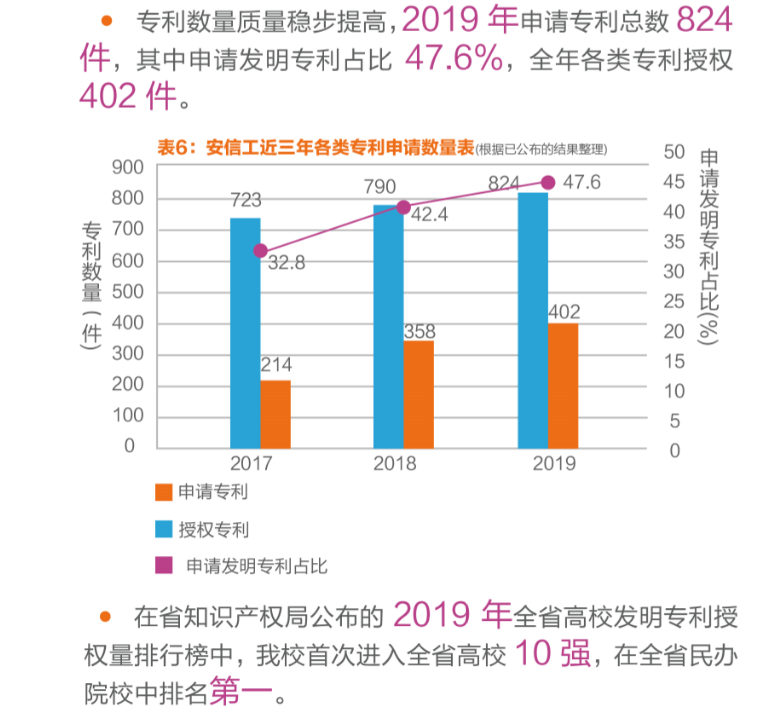 2020年初,安徽省市场监督管理局(省知识产权局)公布了2019年全省知识产权主要数据的排行榜,安徽信息工程学院的发明专利年度授权数量首次进入全省高校十强!前九位均为985、211高校和省属重点高校。发明专利的数量和质量一直是衡量一所高校自主创新能力的重要指标。近年来,安徽信息工程学院十分重视专利创新工作,以专利为载体开展大学生创新教育。同时逐步完善专利管理体系,加大专利创新的奖励力度,为师生提供了有效的政策支持与切实的物质保障,激发了师生申报和维护知识产权的热情。以专利创新为龙头的创新实践活动遍及到全校所有年级和专业,创新氛围浓厚。近三年,全校累计申请各类专利2680件,其中发明专利申请1160件,占申请量的43%;各类授权专利已达992件,其中发明专利授权62件。在省内同类高校中名列前茅,实现了专利数量、质量的双提升。同时,在芜湖大学生专利创新大赛上,安徽信息工程学院连续四届保持了参赛作品数量、晋级复赛作品数量和获奖总数的第一。共获得204个奖项、其中特等奖和一等奖13个。专利目前已
