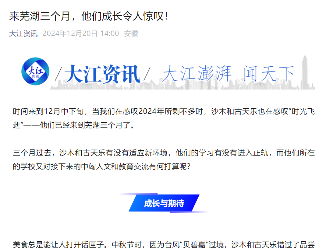 2024年12月20日 新京报 来芜湖三个月,他们成长令人惊叹!时间来到12月中下旬,当我们在感叹2024年所剩不多时,沙木和古天乐也在感叹“时光飞逝”——他们已经来到芜湖三个月了。三个月过去,沙木和古天乐有没有适应新环境,他们的学习有没有进入正轨,而他们所在的学校又对接下来的中匈人文和教育交流有何打算呢?成长与期待美食总是能让人打开话匣子。中秋节时,因为台风“贝碧嘉”过境,沙木和古天乐错过了品尝芜湖麻辣烫和水煮牛肉的机会。三个月过去,他们补上这个遗憾了吗?两位留学生表示,目前他们已经完全适应芜湖的天气和饮食,学习生活渐入正轨。几个月以来,他们品尝了红皮烤鸭、鸡丁米线、水煮牛肉等特色美食,但本地菜肴的一些“辛辣刺客”让其有所顾忌,准备在做好充分“心理建设”的情况下,再去品尝芜湖麻辣烫和火锅等美食。沙木和古天乐关于他们“学习生活渐入正轨”的描述所言非虚。在上一次采访时,沙木基本可以使用汉语进行交流,而古天乐则属于“完全无法沟通”状态——这令记者都替他的留学生涯捏了一把汗。而现在,情况则大不