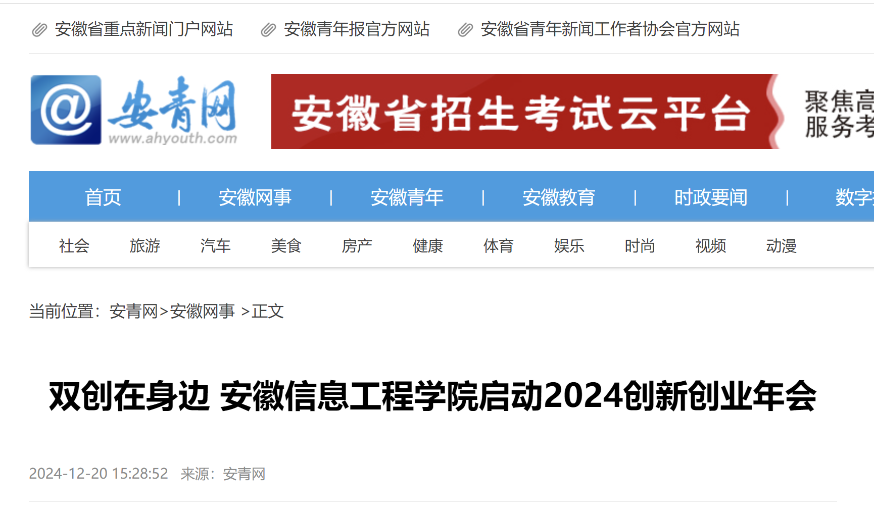 2024年12月20日 安青网 双创在身边 安徽信息工程学院启动2024创新创业年会为强化创新创业实践,加强优秀成果的宣传和示范推广,吸引更多的学生参与创新创业活动,推动开展更多学术交流和成果推介,12月18日,安徽信息工程学院举办主题为“创新引领,创见未来”的2024创新创业年会。活动遴选各类创意创新作品,系统展示了学生在学科竞赛作品、专利创新、大学生创新创业训练计划项目等方面的创新创业成果。启动仪式上,安徽信息工程学院副校长朱尚玉、湾沚区人社局书记李明慧、湾沚区人社局局长兼紫云英创新创业学院副院长张英、紫云英创新创业学院执行院长高涛共同为年会揭幕。副校长朱尚玉在致辞中表示,此次2024年创新创业年会包含创新展示、创业市集和创业咨询及经验交流沙龙等系列活动,旨在营造双创氛围年度高峰,吸引更多同学参与到双创活动中来,在活动中更好地感受双创、践行双创、受益双创,让同学们在双创平台上实现自我、超越自我、绽放活力。近年来,学校结合培养方案举办专业基本技能过关周、高数水平测试赛、英语水平测试赛、