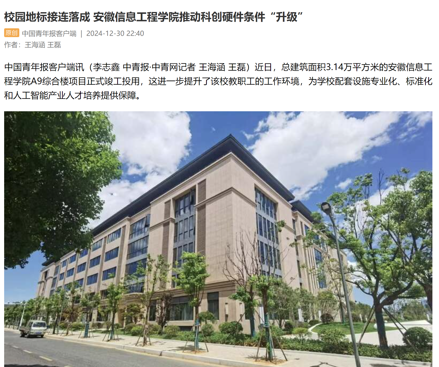 2024年12月30日 中国青年报客户端 校园地标接连落成 安徽信息工程学院推动科创硬件条件“升级”近日,总建筑面积3.14万平方米的安徽信息工程学院A9综合楼项目正式竣工投用,这进一步提升了该校教职工的工作环境,为学校配套设施专业化、标准化和人工智能产业人才培养提供保障。A9综合楼是一栋集教研、办公的6层综合行政楼,建设初期,面对施工过程中场地狭窄,场地北侧有河道、南侧有道路的难题。中建一局五公司项目团队采用钢板桩与支护桩相结合以及开挖排水沟集水明排的方式,方便后续桩基及底板结构、后期管网、行道树施工,巧妙解决施工难题。此外,项目团队协调施工现场各类资源的合理配备,运用精益建造体系,各工作面穿插流水施工,确保了项目的按期交付。安徽信息工程学院是由科大讯飞股份有限公司举办,有安徽工程大学师资力量传承和中国科学技术大学技术支持的省属本科高校,一直致力于提升科创环境和基础设施建设,每年投入千万余元经费进行创新创业实验室建设,鼓励学生在校孵化项目。一段时间以来,中建一局五公司作为总承包单位,建