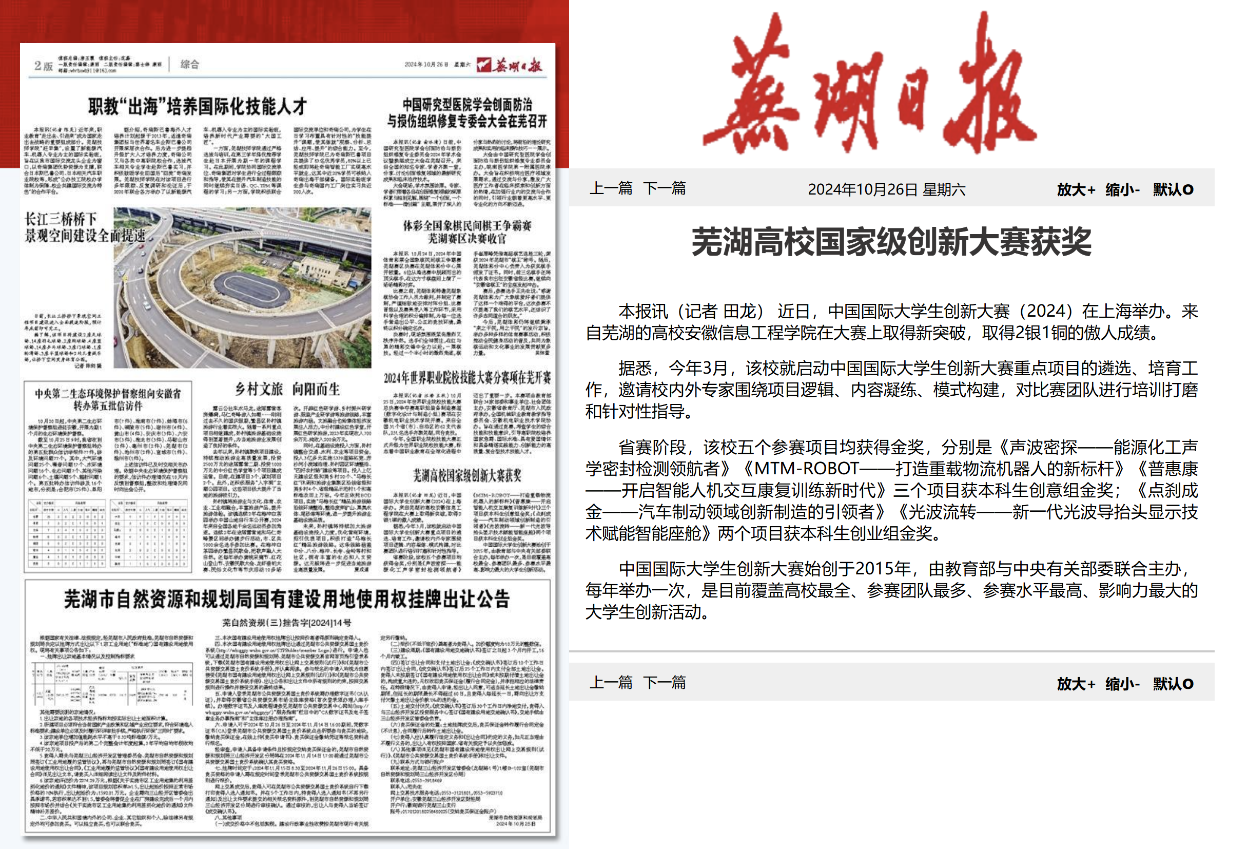 2024年10月23日 安徽青年报 稻花田里话节粮本报讯 10月16日是第44个世界粮食日,当天,为引导青年学生理解农业科技创新,营造爱粮节粮、共同维护粮食安全的良好氛围,安徽信息工程学院组织学生代表,走进中联重科峨桥智慧农场,开展劳动教育认知实践活动,观摩田间地头的“智慧农业”。在中联智能农业展厅,学生们现场观摩了智慧农业平台及智能农机演示,了解中联重科关于“智慧农业+智能农机”双轮驱动战略布局产品体系。“这是我们的谷物联合收割机,最高转场速度能达到每小时37千米,并能同时收割玉米、谷子、高粱等农作物,有了这样的产品,我们能将中国人的饭碗牢牢地端在自己手中。”基地负责人赵斌向学生们展示了最新农机产品。自2020年9月,中联重科水稻数字化种植成果已通过专家评审,在国内率先实现水稻数字化、标准化种植。在讲解人员的指导下,学生们在田间地头体验了使用手机、平板等通信设备远程操控智能闸门和自动灌排。讲解人员介绍,通过30米高鹰眼系统和无人机自动巡田,在农作物长势、病虫害防治方面能够大幅节约人工